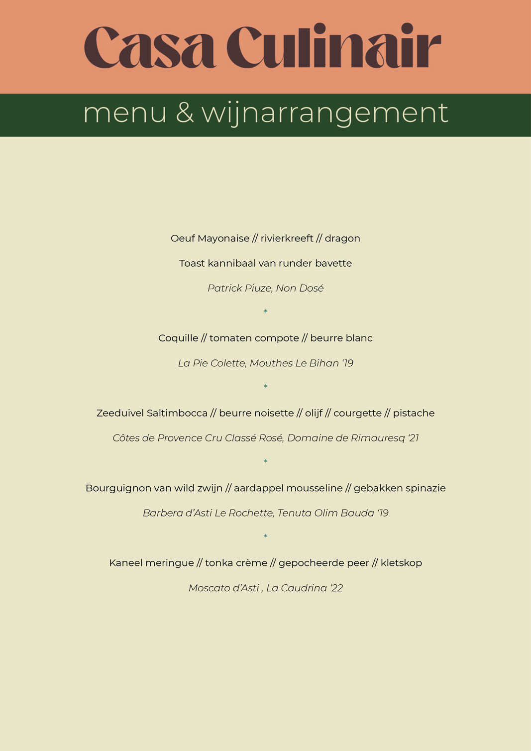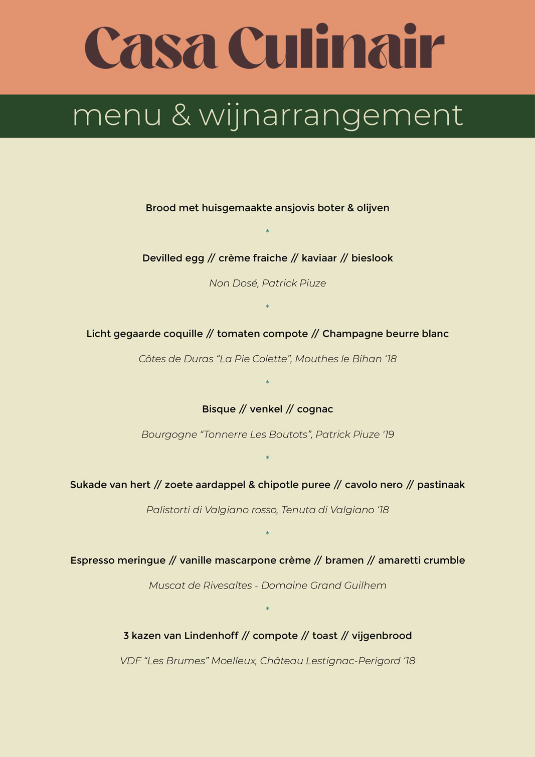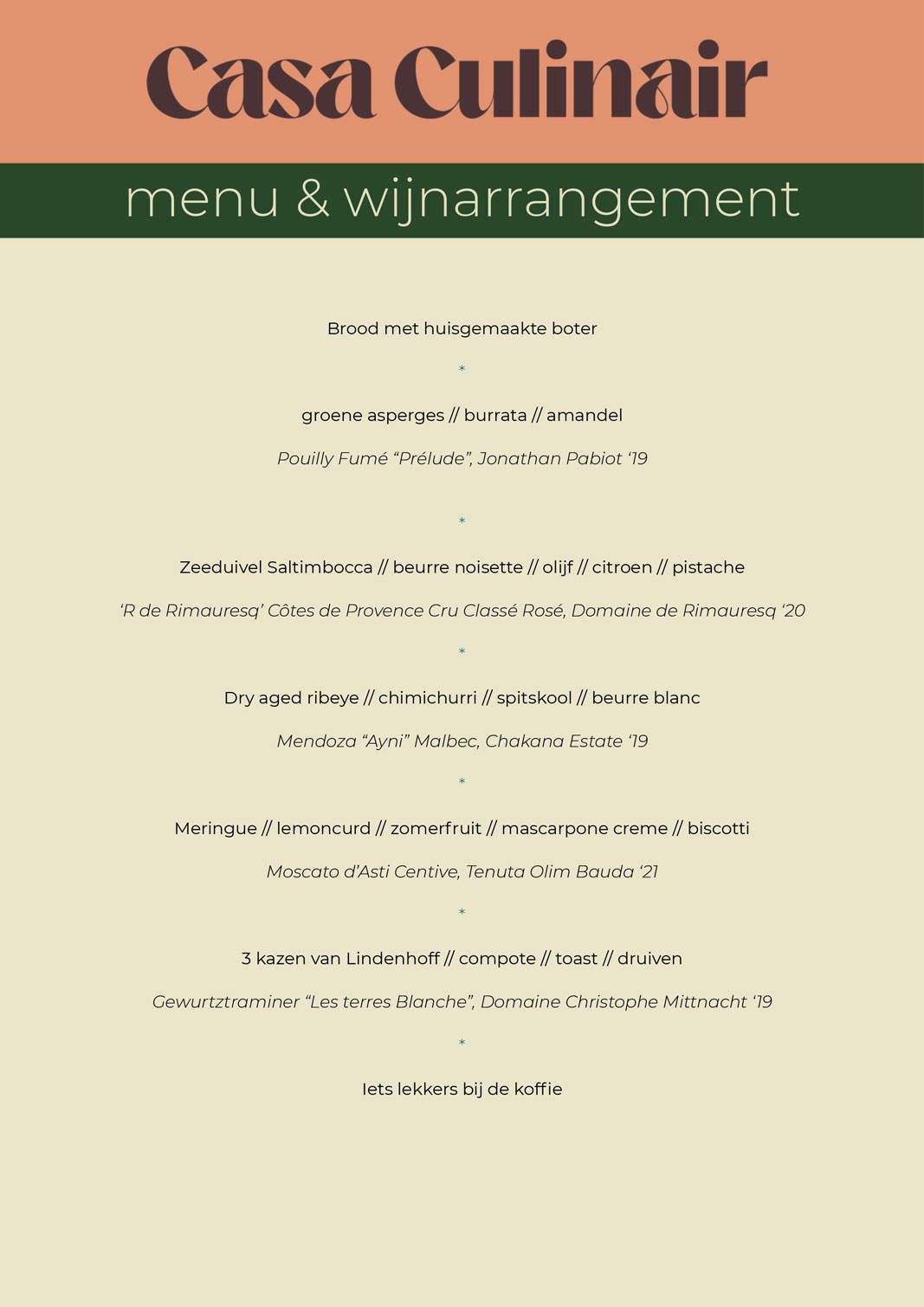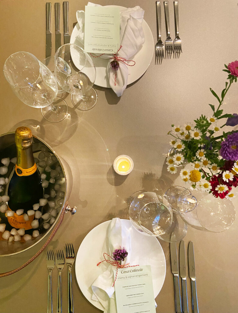 We willen iedere ervaring met Casa Culinair een persoonlijke maken. Het menu en wijnarrangement ontwikkelen we daarom pas nadat we weten wat jij graag eet en drinkt. Het liefst verzorgen we een complete ervaring waarbij de gerechten en wijnen perfect op elkaar zijn afgestemd. Maar ben je geen groot liefhebber van wijn, of heb je zelf wijnen liggen die je graag drinkt, dan is dat natuurlijk geen enkel probleem.