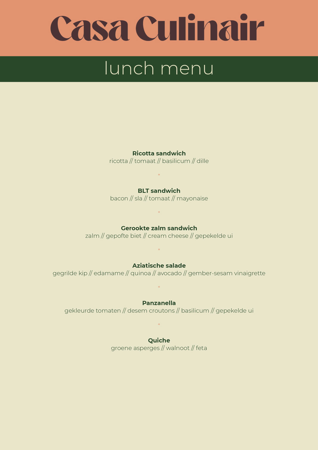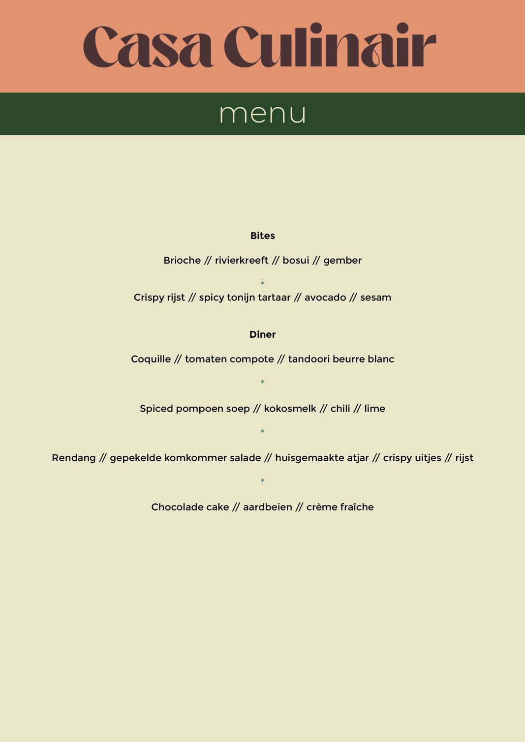 Hieronder vind je een aantal voorbeeld menu's. Ben je benieuwd wat we voor jou op maat kunnen maken?